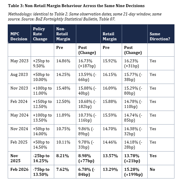 February 2026 is the only decision in which the margins diverged. The retail margin widened by 199 basis points. The non-retail margin compressed by a further 84 basis points. The February 2026 divergence occurred within the same institutions, on the same day, under the same rate cut and the same cost structure. The country risk charge may have risen following the expiry of Zambia’s IMF Extended Credit Facility in January 2026, but any such revision applies identically to retail and non-retail lending within the same institution and cannot explain the divergence.