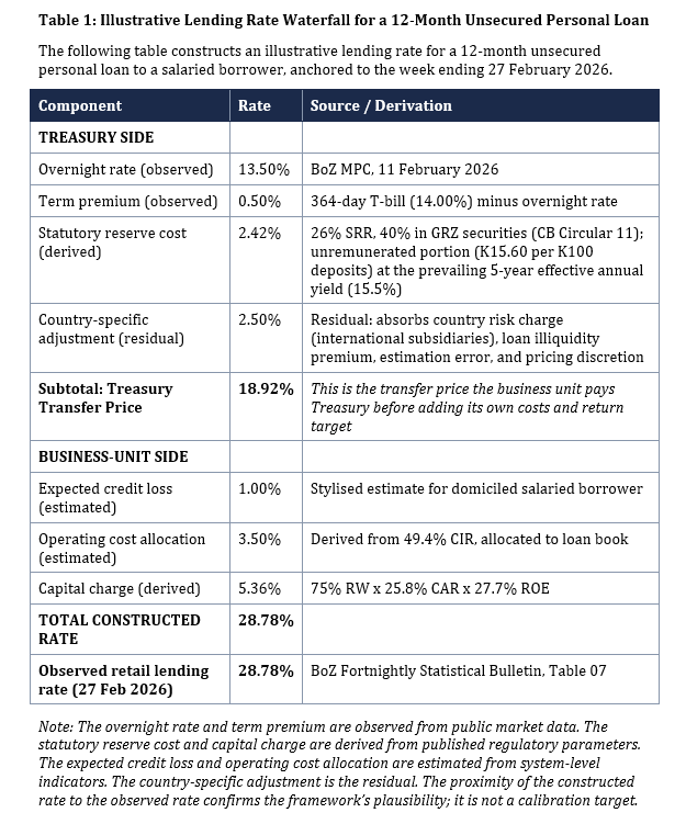 The regulator requires banks to hold equity against every loan. Under the BoZ’s Credit Risk RWA Directives (2025), a qualifying unsecured retail loan attracts a 75 per cent risk weight. At this weight, allocated equity per K100 of retail lending is approximately 19.4 per cent (75 per cent of the system capital adequacy ratio of 25.8 per cent). The sector earned a cumulative return on equity of 27.7 per cent in 2025. The waterfall uses the realised system ROE as a proxy for the return target banks price into retail loans. Individual banks set segment-specific hurdle rates that may differ from the system-wide outcome. The capital charge is 5.36 percentage points.