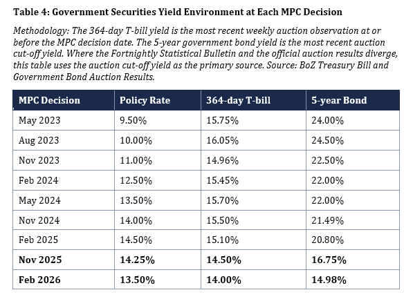 The government securities yield data in Table 4 is sourced to the BoZ Treasury Bill and Government Bond Auction Results. The 364-day T-bill yield is the most recent weekly auction observation at or before the MPC decision date. The 5-year government bond yield is the most recent auction cut-off yield. Where the Fortnightly Statistical Bulletin and the official auction results diverge, this table uses the auction cut-off yield as the primary source. The February 2024 5-year bond yield is sourced to GRZ Bond Auction No. 02/2024/BA (16 February 2024, cut-off 22.00 per cent) rather than the time series observation.