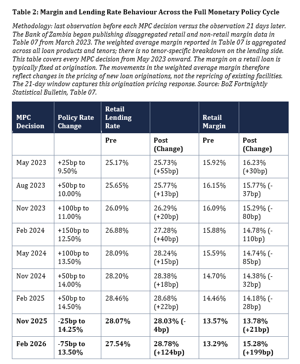 The lending rate and margin data in this essay are sourced to the Bank of Zambia Fortnightly Statistical Bulletin, Table 07 (available at boz.zm/fortnight-statistics.htm). The Bank of Zambia began publishing disaggregated retail and non-retail interest rate data in Table 07 from March 2023. The full-cycle analysis in Table 2 uses the last observation before each MPC decision and the observation 21 days later, applied consistently across all nine episodes from May 2023 onward. The February 2026 observations are from weeks ending 6 February (pre-cut) and 27 February (post-cut). Readers may verify the underlying data by requesting the specific Table 07 bulletin editions from the Bank of Zambia or by contacting the author. The January 2026 monthly average (28.02 per cent retail, 21.90 per cent non-retail) provides baseline context.