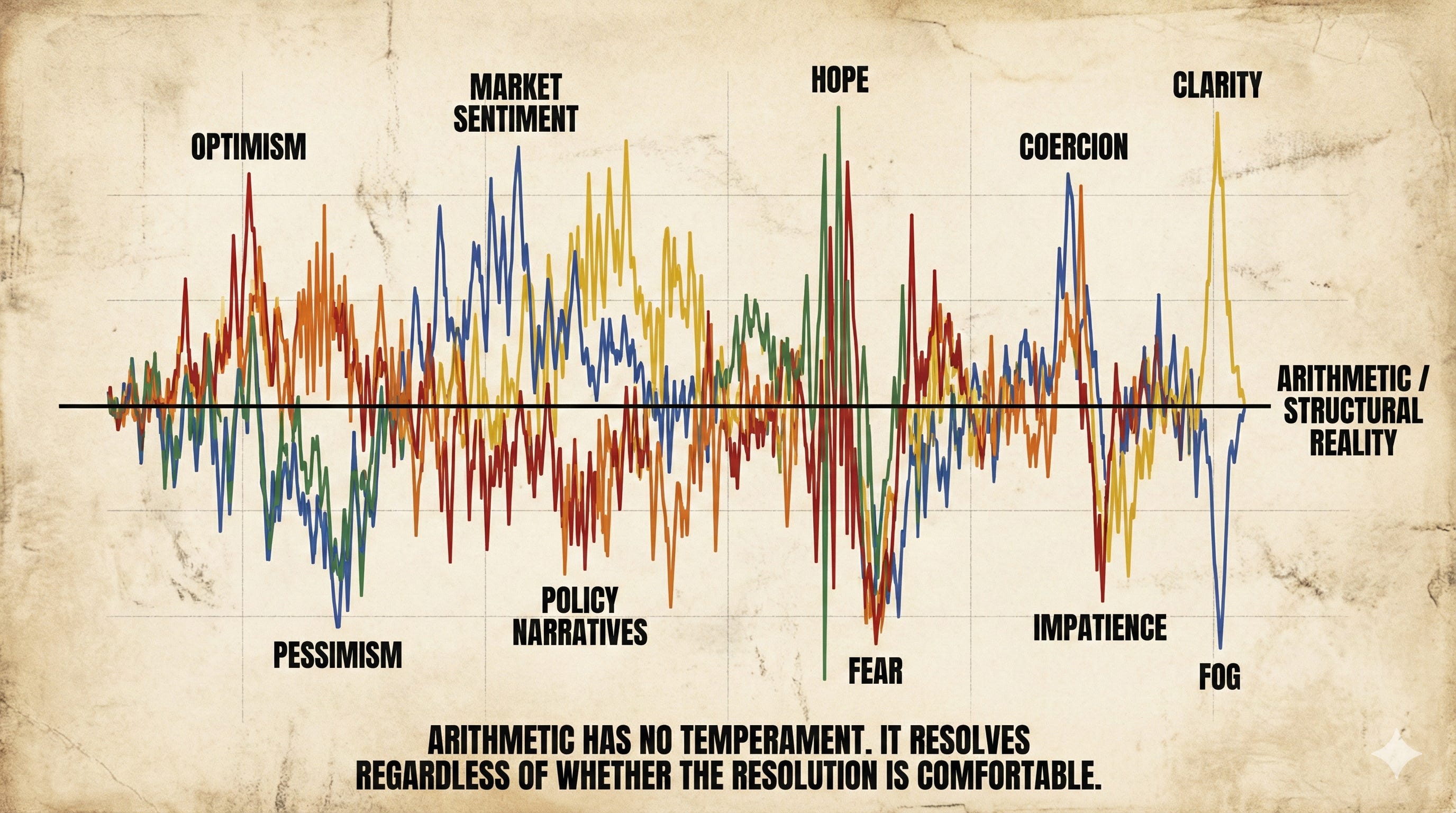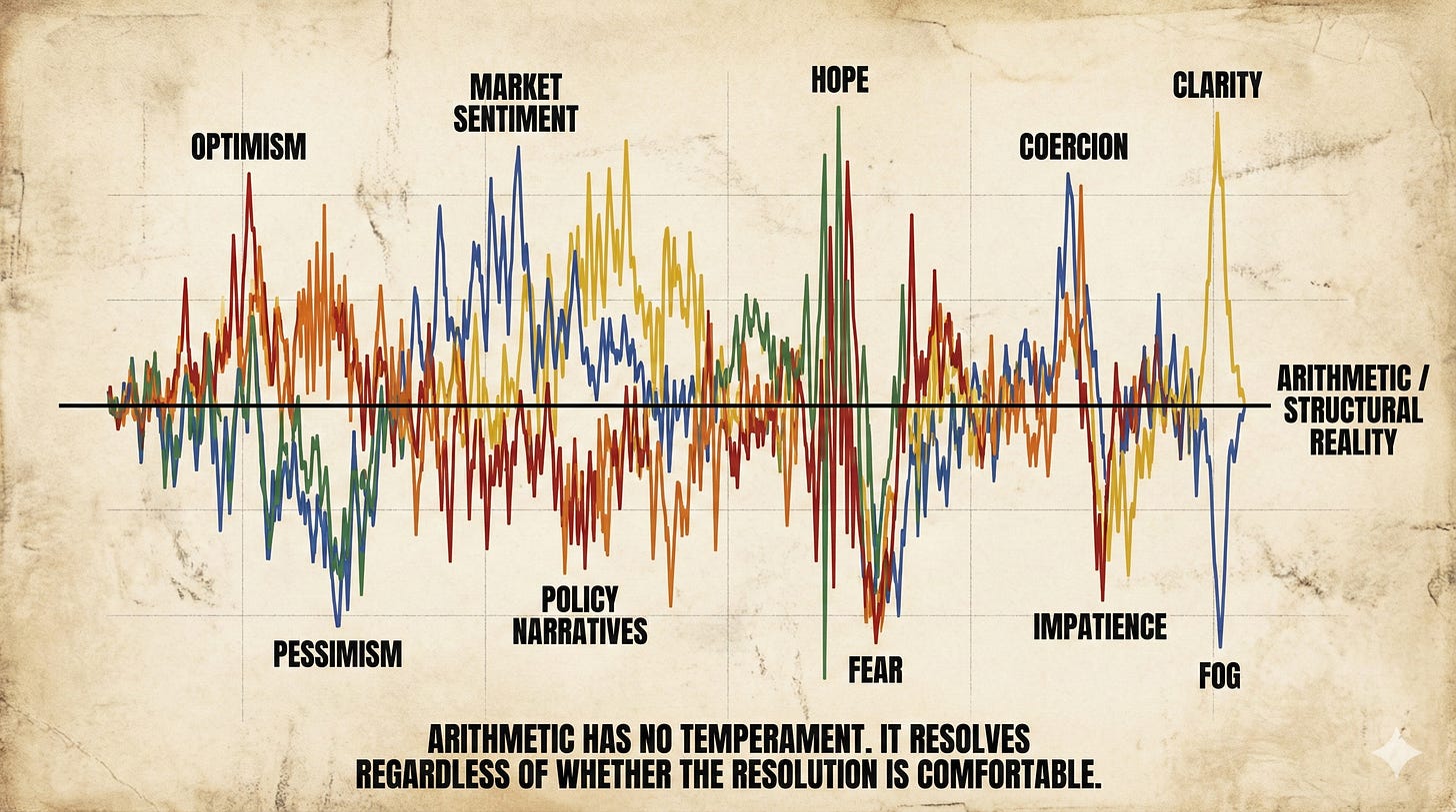 Analysis itself faces the same distortion. Explaining fiscal and monetary constraints together, showing how progress on one side can introduce pressure on another, mapping rollover arithmetic under different scenarios becomes labelled as bearish. The numbers themselves are not disputed. The implications are resisted. Arithmetic has no temperament. It resolves regardless of whether the resolution is comfortable.