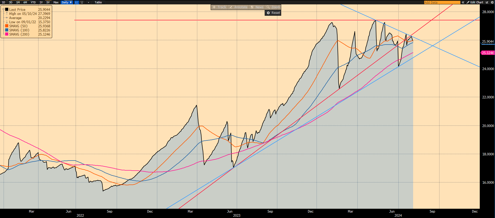 · On June 27, 2024, the market breached a downward triangle pattern established since June 2023 and is now trading within another triangle pattern, indicating potential for another breach lower.