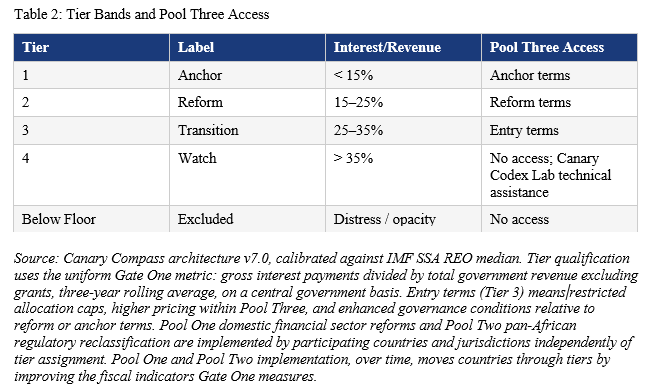 Gate One is the locked metric. It determines the baseline tier assignment for every country. It is objective, formula-driven, and universally applied. Four tiers, calibrated against the IMF SSA median of approximately 12 to 14 per cent, as set out in Table 2. Countries in fiscal distress or data opacity sit Below Floor, with no Pool Three access until their metrics improve to Tier 4 or better.