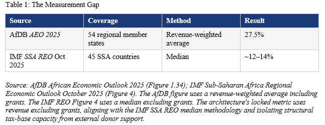 The near two-to-one gap is a statistical artefact with three causes: aggregation method (revenue-weighted average versus median), sample composition (all-Africa versus SSA-only), and the weight of high-ratio economies. Egypt reaches 84 per cent in FY2023/24 first ten months (IMF CR 24/274), but Kenya (~30 per cent), Nigeria at the federal level (~41 per cent), and Angola (~32 per cent) also pull the revenue-weighted average sharply higher. The IMF covers Egypt in its Middle East and Central Asia REO rather than its SSA sample, which accounts for part of the divergence between the two figures but does not eliminate it. Both methodologies are defensible. No single African institution currently produces a standardised, country-comparable, independently verified fiscal dataset that resolves this ambiguity.
