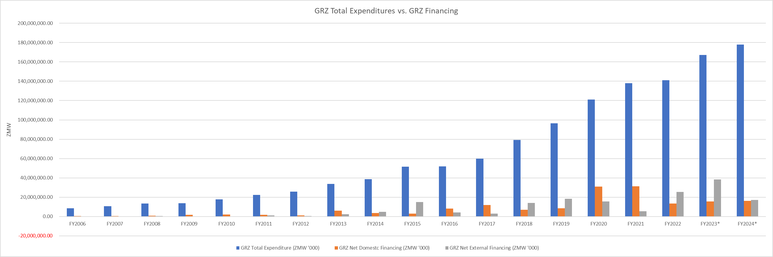 Nevertheless, government expenditures materially escalated despite opportunities to curtail domestic borrowing, especially in pre-FY2022. For example, from FY2016 to FY2021, GRZ expenditures increased 21.8% per annum on average, notwithstanding clear warning signs that GRZ’s fiscal posture was becoming unsustainable. The 2022 and 2023 GRZ fiscal years, while opportunities to address this issue, remain consistent with the established pattern of high domestic market borrowings, especially since net external financing remains somewhat constrained, thereby limiting GRZ’s ability to impose a sufficient dent to domestic borrowing.