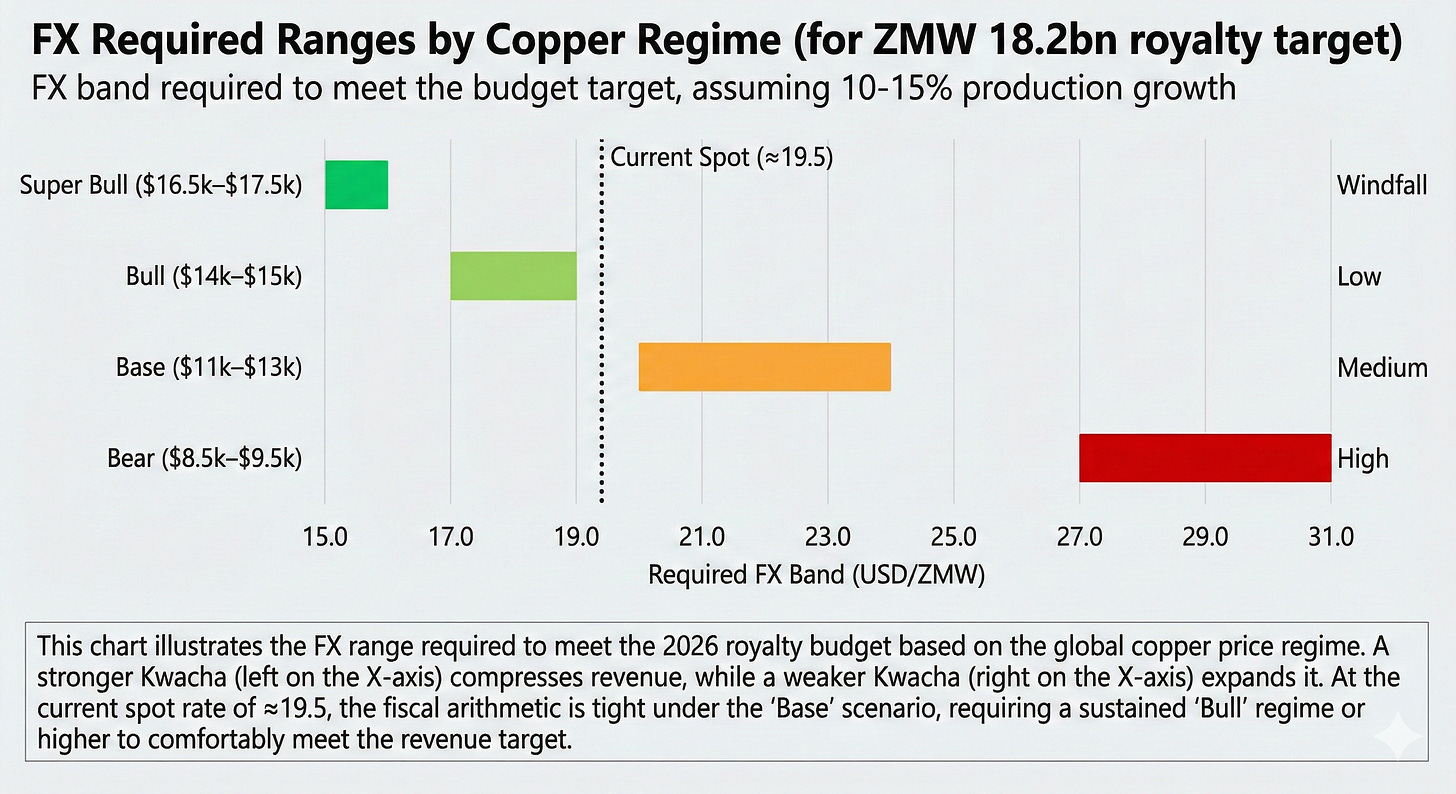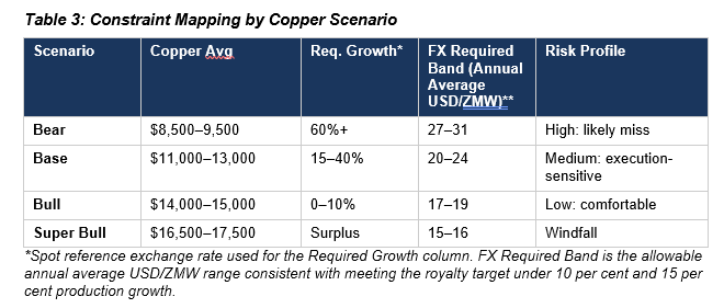 The table below summarises the fiscal constraint logic across regimes. The “Required Growth” column shows the production growth required at the spot reference exchange rate. The “FX Required Band” column shows the strongest allowable annual average USD ZMW range that still delivers the royalty target under two production growth assumptions, 10 per cent and 15 per cent, holding the effective take factor constant. Required growth uses spot FX as a reference point, while the FX band reflects the annual average rate required to meet the target.