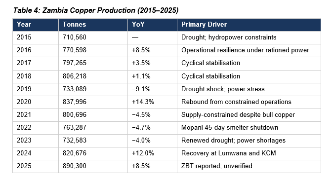 The compound annual growth rate from 2015 to 2025 is approximately 2.3 per cent per year. Over the entire decade, only two years exceeded 10 per cent growth: 2020 and 2024. Both followed periods of contraction. The 2021 observation is particularly instructive: copper prices were elevated globally, yet Zambia’s production fell. This confirms that correlation between copper prices and Zambian output can break down when supply constraints dominate.