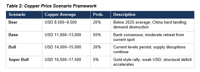 Super Bull (5%): A windfall scenario. At USD 16,500–17,500, the fiscal generates surplus even with flat production. This requires a 2025 gold-style rally spilling into copper, sustained supply disruptions, and a weaker USD.