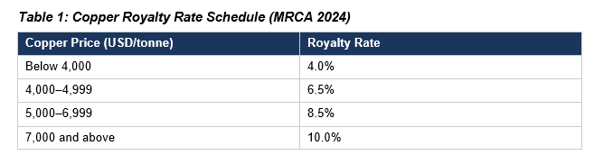 Under Zambia’s mineral royalty schedule as amended in 2024, copper royalties operate on a sliding scale. At prices above the top threshold, the royalty rate does not rise further. This means high copper does not create a rising tax rate, it creates a higher norm value base. The fiscal benefit is linear, not convex.