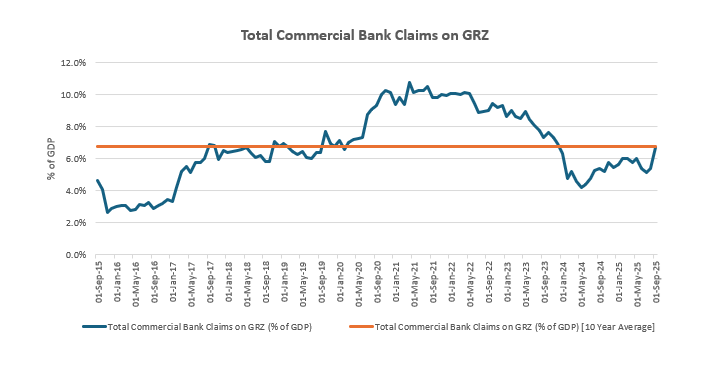 Over the last decade, total commercial bank claims on government (current stock: 6.7% of GDP; decade average: 6.8%) have averaged about 36.5% of total kwacha loans and advances to government and the private sector. In September 2025, the share stood near 33%. On the surface, a third does not look excessive. Many larger banking systems carry similar or even higher sovereign shares without impairing private credit.