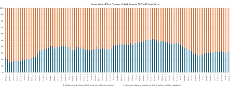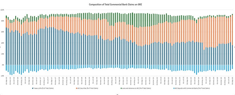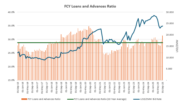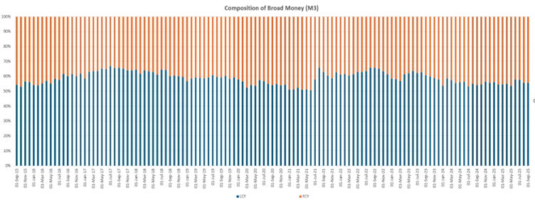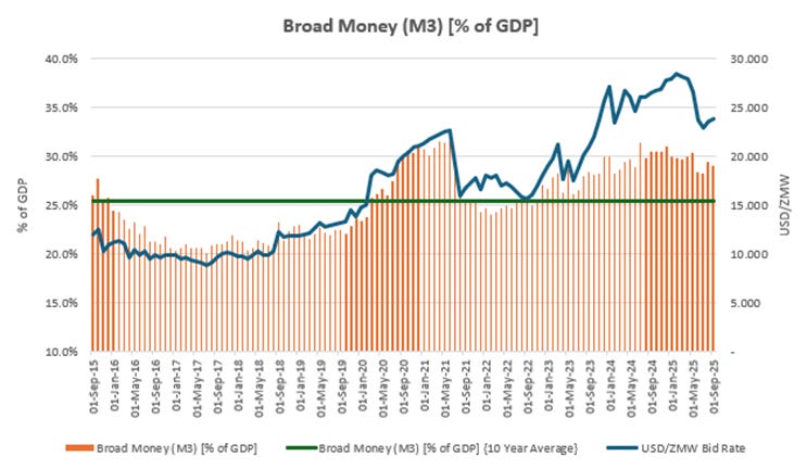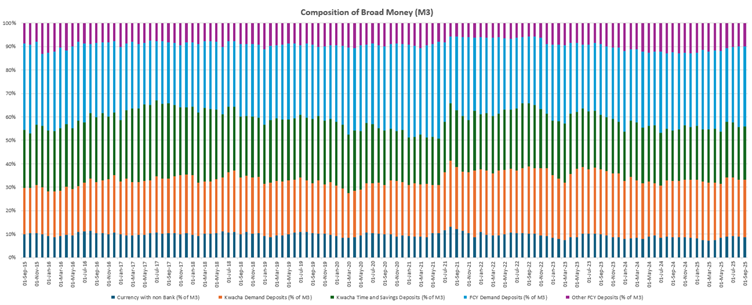 At around 44% in September 2025, foreign-currency deposits account for a material share of broad money. Changes in the exchange rate alter the kwacha value of these deposits and, in turn, M3, even when the underlying dollar balances remain unchanged. The result is a money aggregate that moves with valuation effects rather than with lending decisions, creating a structural disconnect between the policy rate and the growth of broad money.