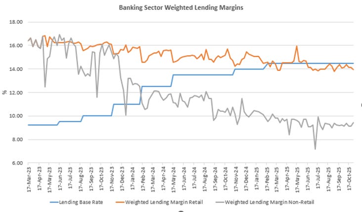 The core question is no longer whether the MPC should cut. The real question is whether a cut can move through a shallow, dollar-dominated, sovereign-heavy system and reach households, small businesses, and productive firms. This article answers that directly. It shows that the money base is too small, the deposit structure too fragile, and the credit system operates with wide opaque margins and is also material enough in government securities to prevent easing from delivering broad relief. The recent rate cut changes the optics. It does not repair transmission. In a system funded by short-term deposits that support longer-term variable-rate loans, price stability and structural reform matter more than cosmetic relief.