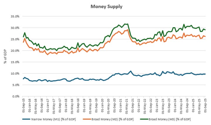 The rest of this article examines those channels in detail. Section 2 turns to the structure of the money supply, liquidity and credit. It shows how broad money has become an exchange-rate-driven aggregate and why shallow money depth prevents the policy rate from shifting credit volumes. Sections 2.3-2.7 analyse credit allocation, deposit pricing, lending rates, the sovereign nexus, and foreign currency dynamics. Section 2.8 consolidates the structural constraints. The conclusion explains why easing under current conditions risks slower disinflation and why structure must come before sentiment if monetary policy is to work for the majority.