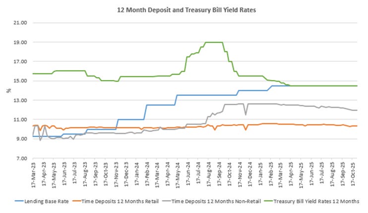 Deposit pricing also shows limited responsiveness to changes in the policy rate. The chart above shows that retail twelve-month deposits remained effectively flat at about 10% to 11% across the entire period, even as the BOZ increased the policy rate.