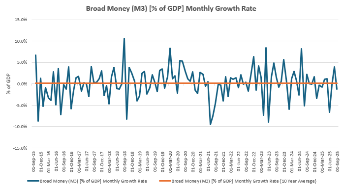 The chart above highlights the sharp month-to-month swings in broad money relative to GDP. These movements reinforce that M3 behaves as a highly volatile series rather than a stable monetary layer. The pattern aligns with the earlier discussion: liquidity in Zambia does not follow a smooth, credit-driven path but shifts abruptly when underlying valuation effects change. The volatility shown here is therefore not noise but a structural feature of the system, and it limits the usefulness of M3 as a guide for policy transmission.