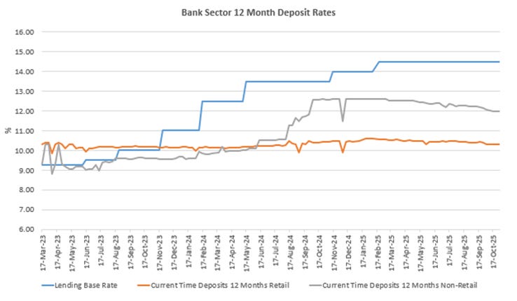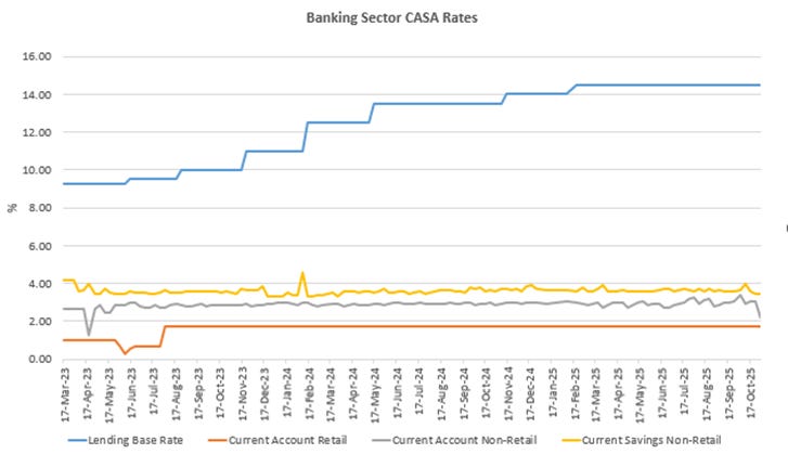 CASA rates remain almost unchanged across the entire period, even as the lending base rate rises. Retail and non-retail current account and savings rates track a narrow band and do not respond to movements in the lending base rate or to changes in monetary stance. This stability reflects the low elasticity of transactional deposits and confirms that the cost of funds at the bottom of the system remains fixed regardless of policy adjustments. The lack of movement in CASA rates partly anchors the wider funding structure and impedes the ability of lending rates to fall when the central bank reduces the policy rate.