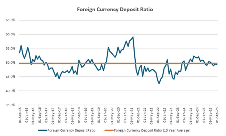 Foreign currency deposits account for a material share of commercial bank funding, and this structure shapes how banks manage liquidity and price credit. Unlike the M3 measure, which includes non-bank holdings, this chart captures the funding base on bank balance sheets. A liability mix with this level of foreign currency exposure makes banks more sensitive to exchange rate movements than to changes in the policy rate, reinforcing weak transmission even when the stance eases.